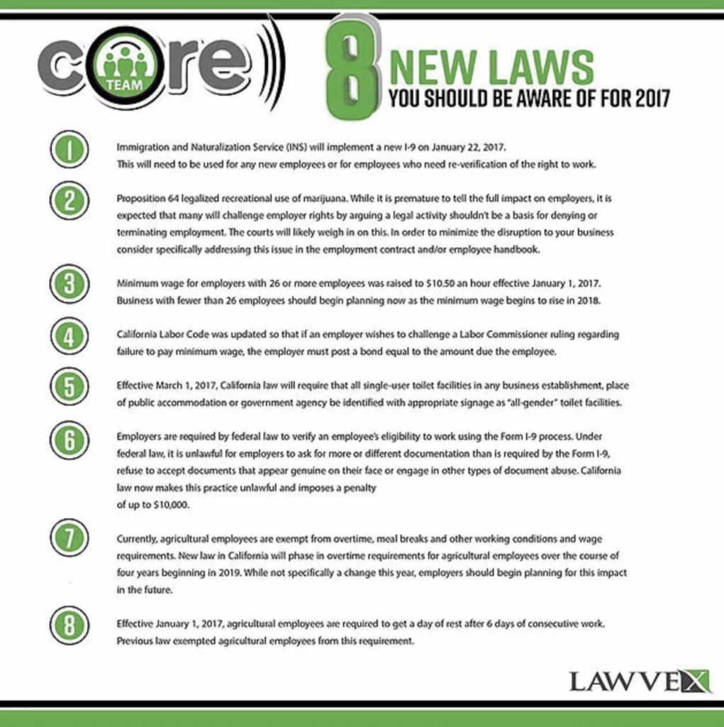 Rules and regulations, and compliance with, are critical components of small business ownership. As is to be expected, the California legislature has been busy at work revising existing regulations and crafting new ones. While not exhaustive, here are 8 that will not only impact you this year, but in years to come.